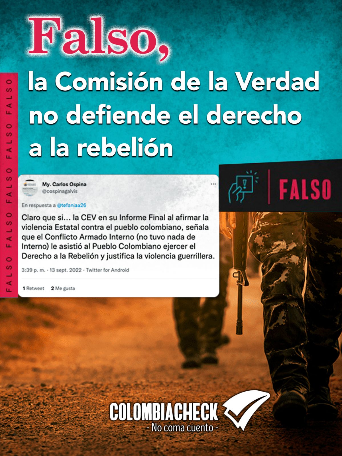 Chequeamos la afirmación hecha el 13 de septiembre y encontramos que es falsa. En la página 131 del tomo del Informe Final de la Comisión de la Verdad (CEV) llamado Hallazgos y Recomendaciones queda clara la posición de la CEV sobre la rebelión: “Este «derecho a la rebelión», reservado en la comunidad internacional para quienes se levantan contra regímenes opresores, no aplica para el caso colombiano”. La entidad pone las comillas en la expresión derecho a la rebelión.
