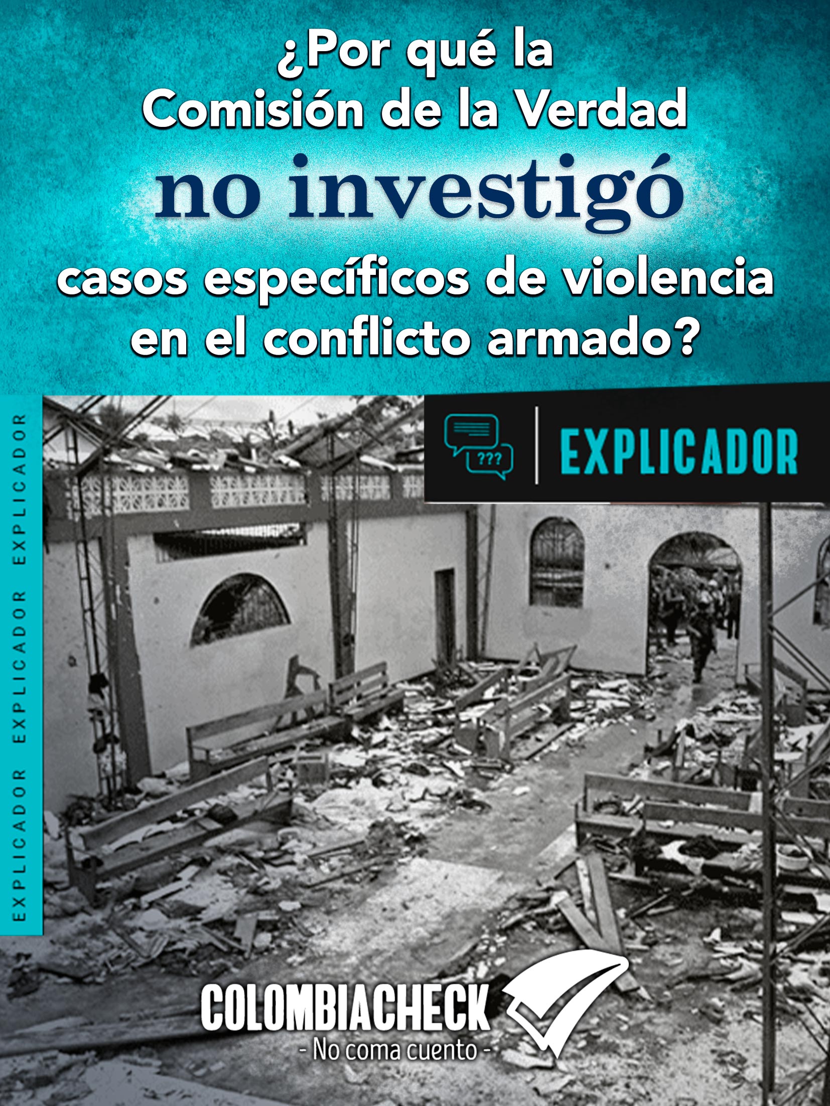 En Colombiacheck ya habíamos indagado sobre los casos analizados por la CEV y encontramos desinformación falsa en torno a supuestas omisiones en el informe final de la Comisión de la Verdad acerca de crímenes perpetrados por las Farc, el ELN y el M-19, como por ejemplo las masacres de Bojayá y Machuca, y la toma del Palacio de Justicia. También se calificó de falsa la información que ha circulado en redes sociales sobre que en el informe final de la Comisión no se abordó la toma guerrillera de Colombia, Huila, ocurrida la noche del 12 de julio del 2000.