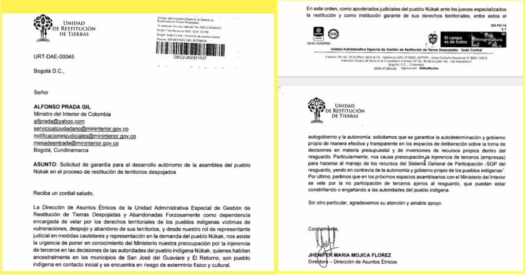 Esta queja no solo fue de las oenegés que acompañaban a los nukak. En febrero de 2023 Jhenifer Mojica, entonces directora de la Unidad de Restitución de Tierras, envió una carta al ministro del Interior Alfonso Prada en la que, como representante judicial en medidas cautelares y representación del pueblo Nukak, denunciaba su preocupación por la “injerencia de terceros en las decisiones de las autoridades del pueblo indígena Nukak”.