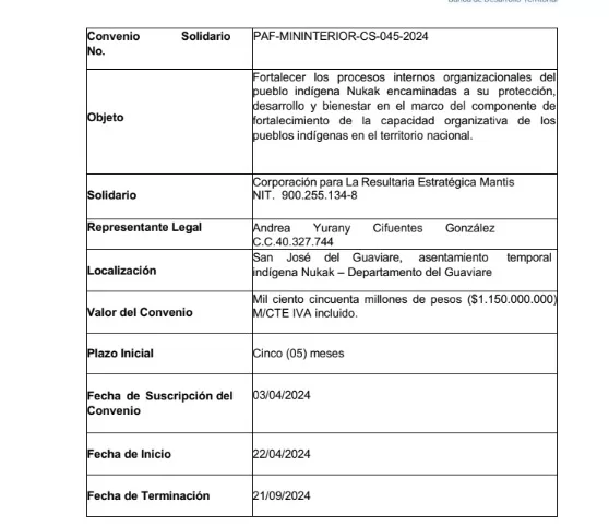 A pesar de cargar con estas acusaciones y de haber sido enlace territorial de Corpogreen, Ortiz, según cuenta una fuente consultada para este reportaje, obtuvo en 2025 un contrato del Ministerio del Interior para desarrollar un plan de vida vital para los indígenas nukaks, en alianza con la Clínica Jurídica Integral de Carlos Chindoy, un abogado indígena del departamento del Putumayo. Ese dato no pudo ser verificado oficialmente en este reportaje.