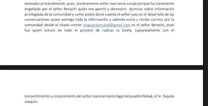 Tiene esa sospecha porque en 2024, otra persona, la administradora pública Jacqueline Henao, denunció ante la Fiscalía General a Jeison Benachi por haberla contratado para realizar una tutela en la que presuntamente se suplantó la firma del abubaka Joaquín Nijbe. “Fui claramente engañada por el señor Benachi”, dice Henao en la denuncia, al señalar que él se presentaba como “el asesor y prácticamente el representante del pueblo nukak”, y le propuso acceder directamente al correo del resguardo.