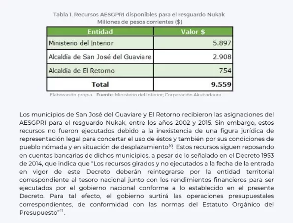 En teoría, una vez concluido el plan de desarrollo en el que deben plasmar sus aspiraciones colectivas, los nukak estarían un paso más cerca de poder acceder a los 9.500 millones de pesos del Sistema General de Participaciones que les debe el gobierno desde el 2000 y que reposa en cuentas de la gobernación del Guaviare y de alcaldías locales, mientras están lo suficientemente organizados como para gestionar ese dinero. Esto, según un informe de 2022 de la Contraloría General de la República en el que indicó que “estos recursos no fueron ejecutados debido a la inexistencia de una figura jurídica de representación legal para concertar el uso de éstos” y que podrían estar ampliamente subvaluados en la medida en que las alcaldías no han respondido a sus reiteradas peticiones para actualizar dicha cifra.