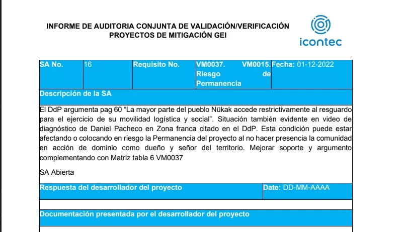 El negocio, como ya se señaló, venía haciendo agua. En un informe de 2022, Icontec cuestionó la falta de claridad en cuanto al manejo de los millonarios recursos que entrarían al resguardo una vez se emitieran los créditos en el mercado de bonos de carbono y el bajo porcentaje (6 por ciento de los ingresos) que el proyecto Deiyiabena REDD+ destinaba al componente ambiental, necesario para la restauración y conservación. Además cuestionó su utilidad para frenar la deforestación, más allá de las acciones ya previstas por el gobierno en materia de restauración ecológica.