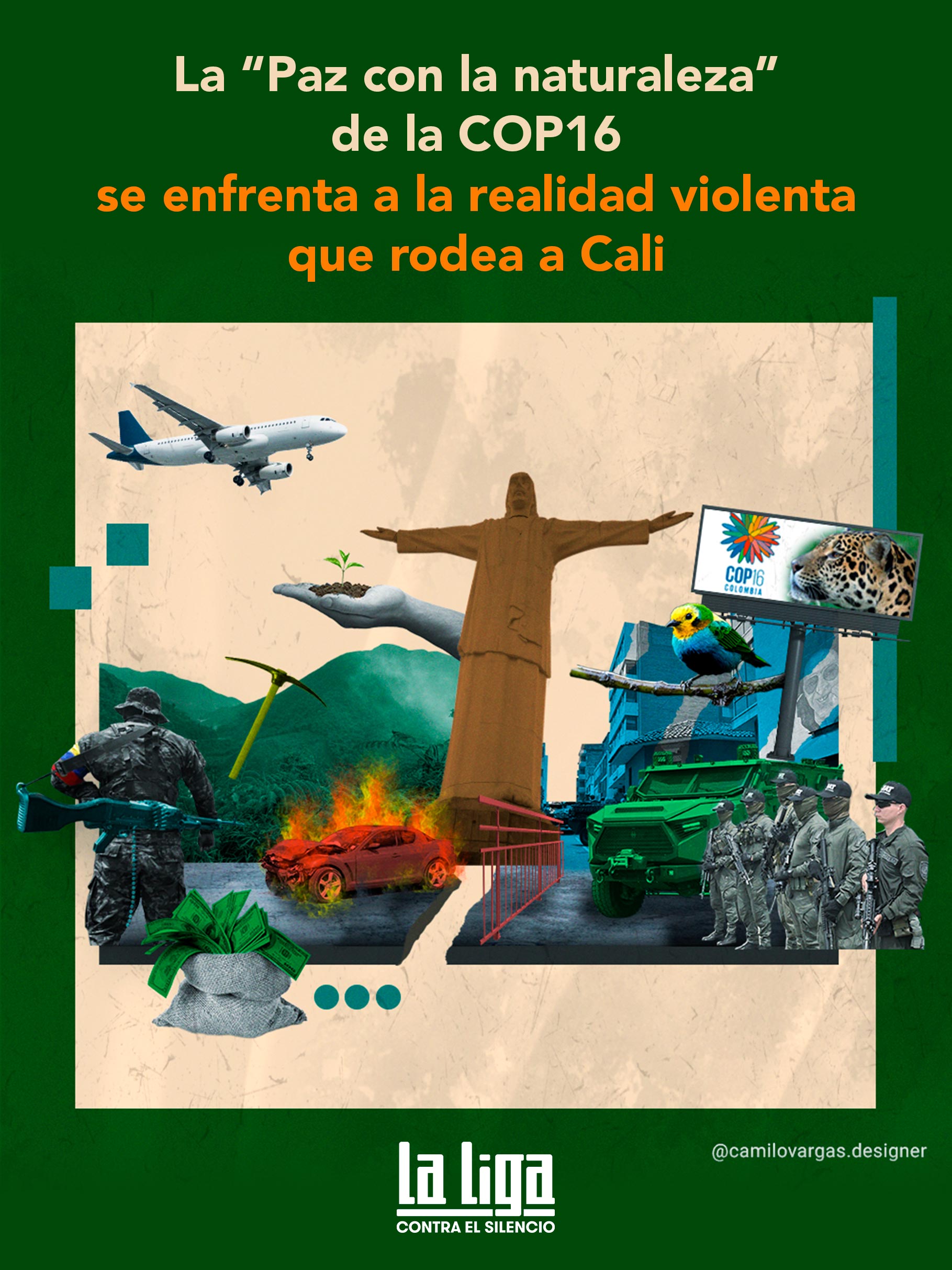 El 21 de octubre inició oficialmente la COP16. Los helicópteros se escuchan en el centro de Cali, por donde tanquetas militares se abrieron paso días atrás en una zona peatonal. Militares y policías vigilan desde los árboles junto al río. La ciudad está militarizada. Mientras en la Zona Azul los delegados de varios países discuten sobre cómo proteger la biodiversidad, en las montañas del Cauca, en ambas cordilleras se vive otro escenario, el de la guerra por los cultivos de marihuana y coca y la minería ilegal.